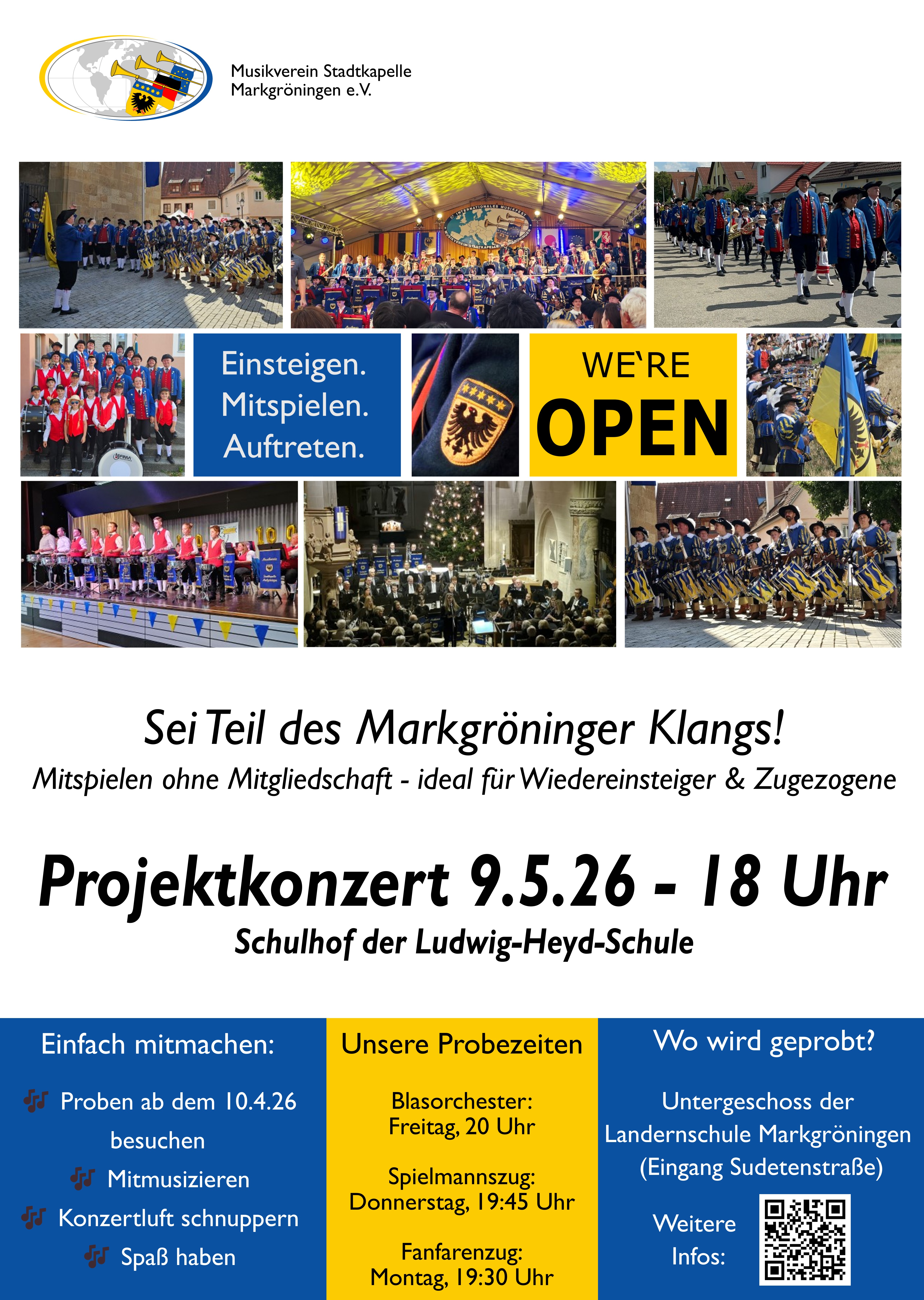 Die musikalischen Abteilungen (Blasorchester, Spielmannszug, Fanfarenzug) des Musikvereins laden alle Interessierten herzlich zu offenen Proben ein.